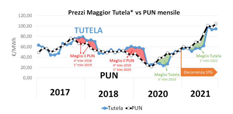 Oltre all’indice di riferimento, cambia la frequenza di aggiornamento dei prezzi, ovvero la velocità di adeguamento della bolletta alle condizioni del mercato elettrico. Con il servizio di Maggior Tutela i prezzi sono definiti trimestralmente prima dell’inizio del periodo. Nelle fasi di mercato fortemente rialziste, come quella che stiamo vivendo in questi mesi, la bolletta del servizio di Maggior Tutela risulta più leggera rispetto ad una indicizzazione puntuale alle condizioni del mercato elettrico. Accade esattamente l’opposto nelle fasi ribassiste del mercato, come evidenziato dal nostro grafico.