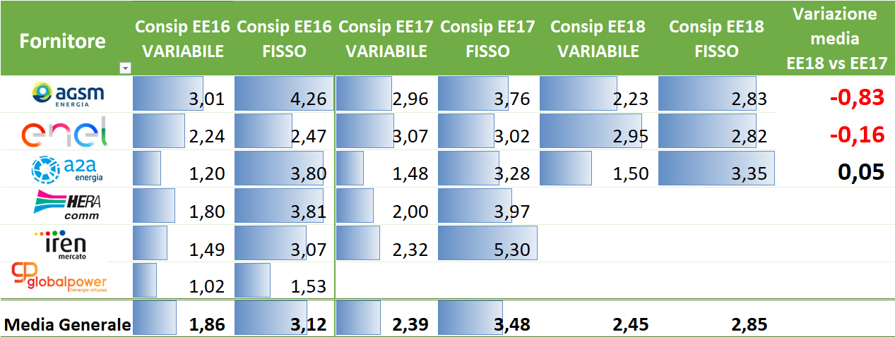Gli spread della Convenzione EE18 sono sostanzialmente in linea con i valori della Convenzione precedente, con un leggero calo nel valore medio degli spread applicati sulla tariffa fissa. Il dato medio degli spread sul prezzo variabile è di 2,45 €/MWh. Per il prezzo fisso è pari a 2,85 €/MWh, in calo di 0,63 €/MWh rispetto allo scorso anno.