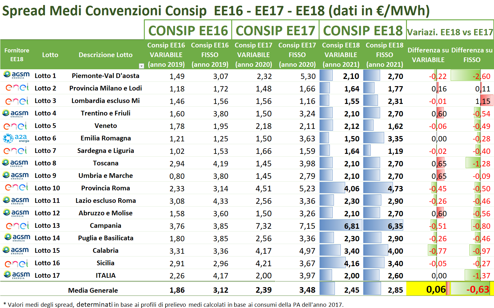 Erano 6 gli operatori nella Consip EE16, scesi a 5 con la Consip EE17. Nell’ultima edizione sono rimasti solo in 3: Enel, AGSM ed A2A. Quest’ultima è l’operatore che ha subito il maggior ridimensionamento, portando a casa un solo lotto. Proprio A2A risulta con spread medi leggermente più alti rispetto all’edizione precedente.