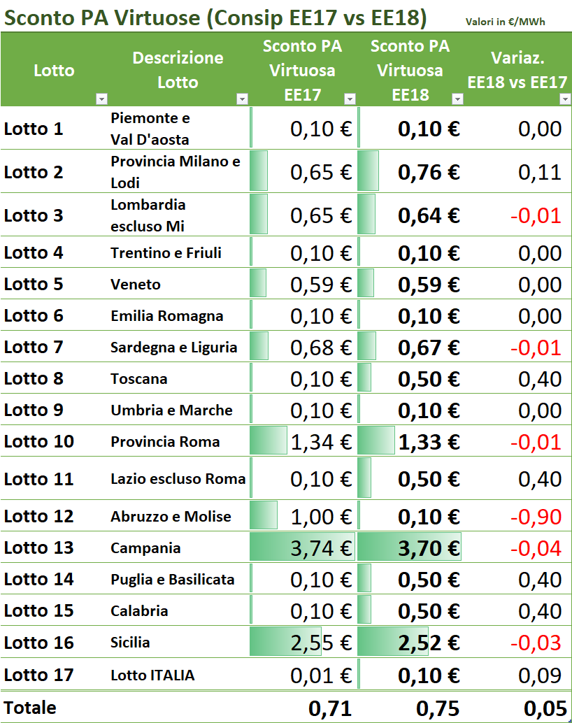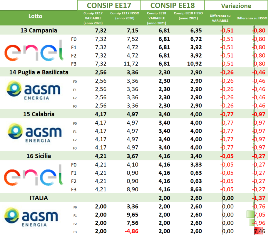 Enel ha applicato una limatura ai prezzi, e questo, probabilmente, ha contribuito alla sua conferma su tutti i lotti dove era presente con la Consip EE17.