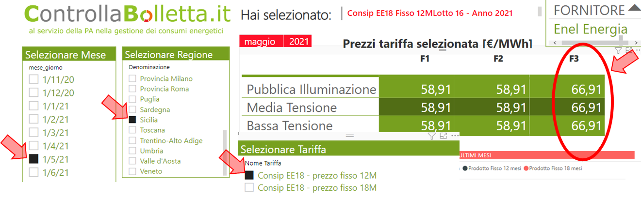 Con Click & Check sono sufficienti tre click per trovare il costo della materia prima indicato in bolletta. Ad esempio, Selezionando la Tariffa “Consip EE18 – prezzo fisso 12M”, decorrenza “maggio 2021”, Regione “Sicilia”, scopriamo che il prezzo che Enel indicherà in bolletta per l’intera durata della fornitura sarà 66,91 in F3 e 58,91 in F1 e F2.