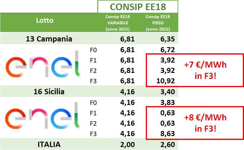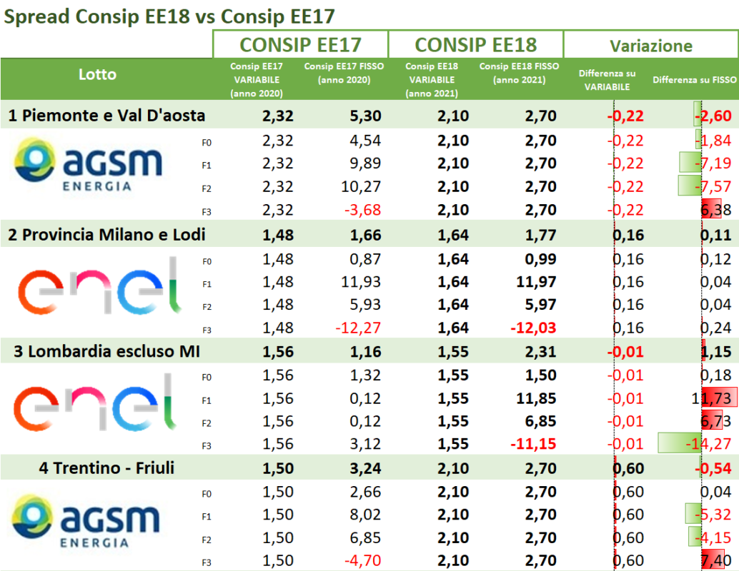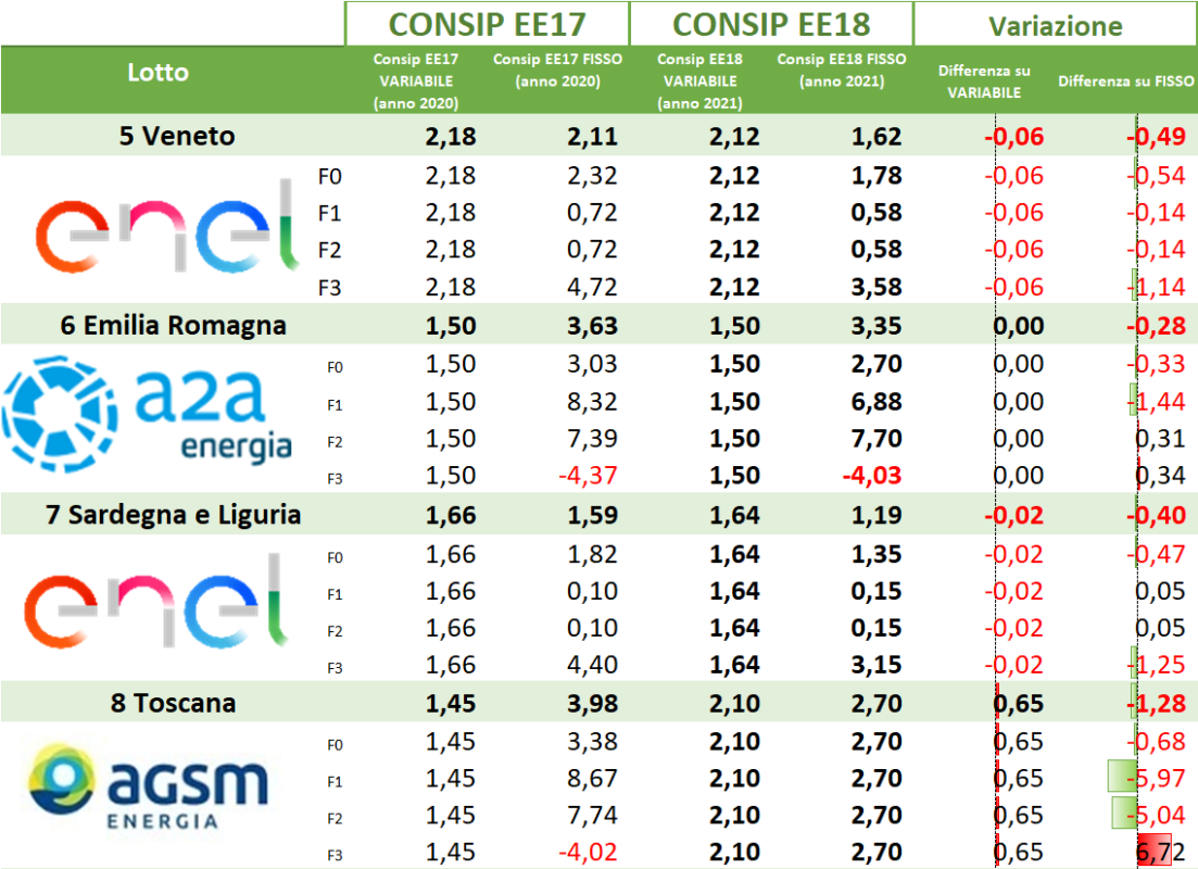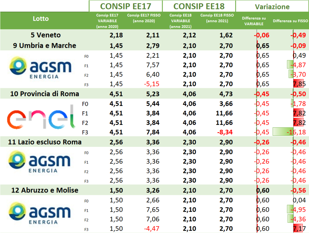 Enel ha applicato una limatura ai prezzi, e questo, probabilmente, ha contribuito alla sua conferma su tutti i lotti dove era presente con la Consip EE17.