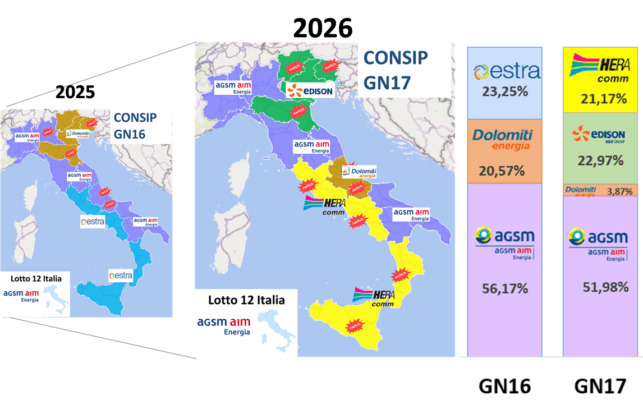 Tutti i Lotti persi da Estra Energia sono stati aggiudicati da Hera Comm, che ritorna protagonista dopo la sorprendente esclusione della passata edizione, aggiudicandosi il Lotto 7 Lazio, il Lotto 9 Campania e il Lotto 11 Calabria e Sicilia. Tutti territori che Hera Comm conosce molto bene, essendo l’attuale fornitore del Servizio di Salvaguardia per le forniture di energia elettrica.