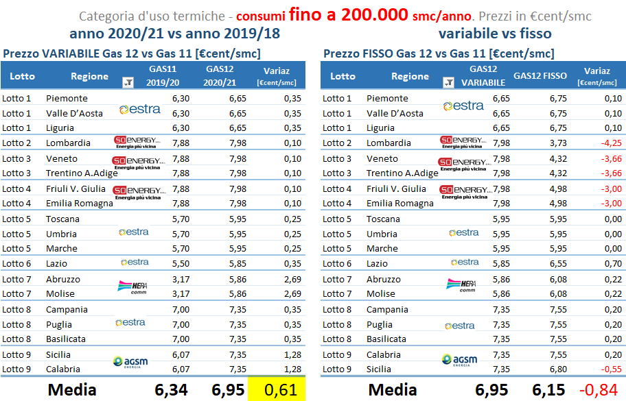 A sorpresa, la regione con il prezzo variabile più basso è il Lazio, con uno spread sul variabile di 5,85 €cent/smc. La regione con il maggiore aumento è il Lotto 7 Abruzzo-Molise, unico lotto aggiudicato ad Hera Comm.