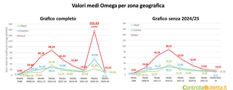 Di seguito, riproponiamo il grafico che mostra l’andamento storico del parametro Omega. Se escludiamo il disastroso biennio 2024-25, scopriamo che gli spread praticati da Hera Comm e Enel Energia sono in linea con quelli delle passate edizioni, con una tendenza al ribasso che è in atto dai massimi del periodo 2014-16.