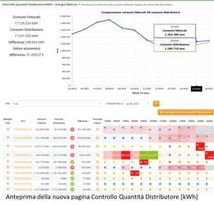 In collaborazione con Ento.ai, abbiamo sviluppato una nuova funzionalità chiamata “Controllo Quantità Distributore” che, con un colpo d’occhio, mostra le differenze tra i quantitativi di energia fatturati e quelli risultanti sul portale del distributore.