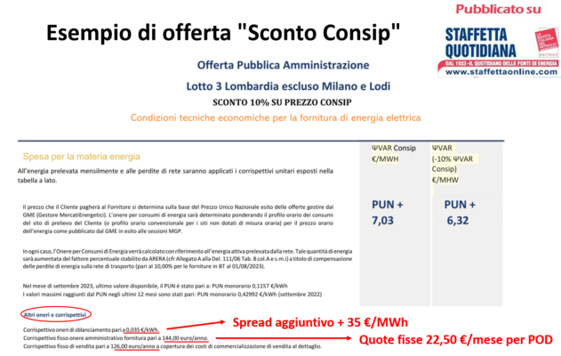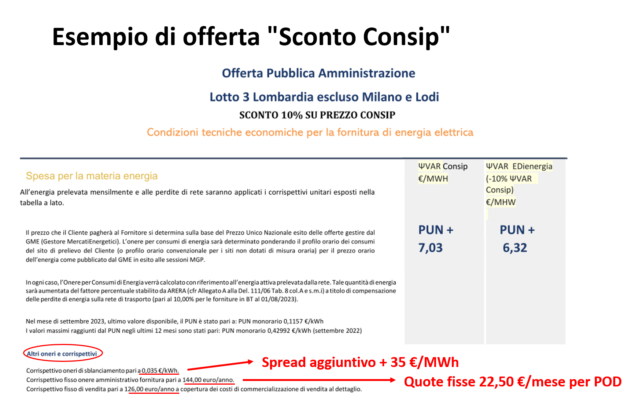 Con uno spread di oltre 40 €/MWh e quote fisse per 22,50 si può avere un risparmio rispetto a Consip? Ovviamente no. Eppure le CTE titolano SCONTO 10%!