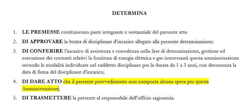 Il broker mi propone addirittura uno schema di determina già pronto, dove c’è scritto che l’Ente risparmia e dove manca solo la mia firma. Perché non firmare? Cosa potrà mai accadere se firmo un incarico dove c’è scritto chiaramente che “il presente provvedimento non comporta alcuna spesa per questa Amministrazione”?