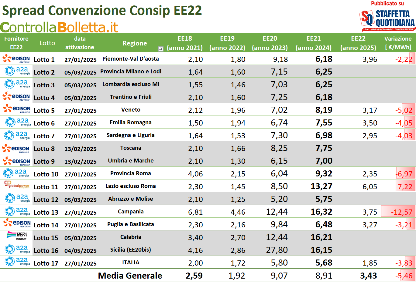 Confermate le aspettative di riduzione degli spread. Prezzi più bassi nei lotti aggiudicati ad A2A. In Campania il calo più evidente. La scorsa settimana sono stati attivati i primi 9 lotti della nuova Convenzione Energia Elettrica 22. L’aspettativa di un calo generalizzato degli spread è stata confermata. Si torna sostanzialmente[...]