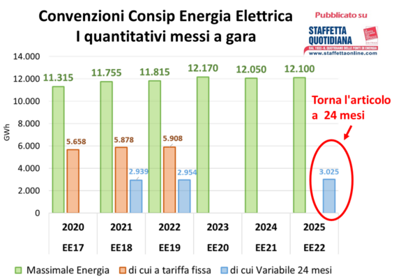 Dopo lo scoppio della crisi energetica, nelle ultime due edizioni Consip aveva eliminato i contratti a prezzo fisso e con durata superiore ai 12 mesi. La scelta fu fatta per semplificare la gara e favorire la massima partecipazione degli operatori. Tante amministrazioni hanno vissuto con frustrazione l’impossibilità di fissare il prezzo e di scegliere una durata maggiore di 12 mesi. Con il senno di poi, possiamo affermare che la scelta di Consip ha fatto l’interesse delle PA. Probabilmente, considerato il netto miglioramento del contesto di mercato, se le PA avessero sottoscritto contratti a prezzo fisso o con una durata più lunga, avrebbero sostenuto un costo maggiore.