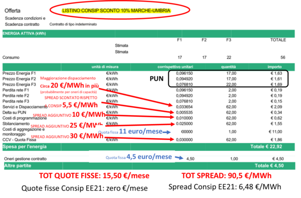 Il caso studio di oggi ne è un esempio lampante. Pubblichiamo una bolletta dove in stampatello troviamo un nome dell’offerta molto rassicurante: “LISTINO CONSIP SCONTO 10% MARCHE-UMBRIA”; ma nei costi contrattuali una serie di maggiorazioni impressionanti.